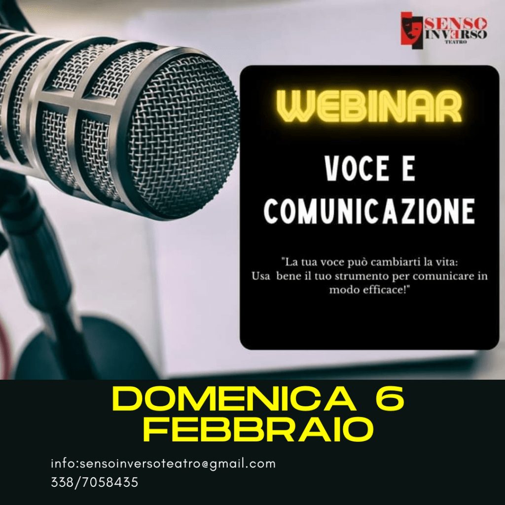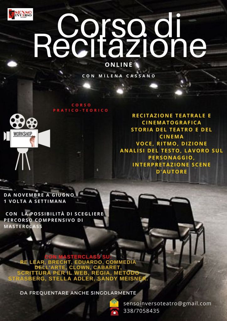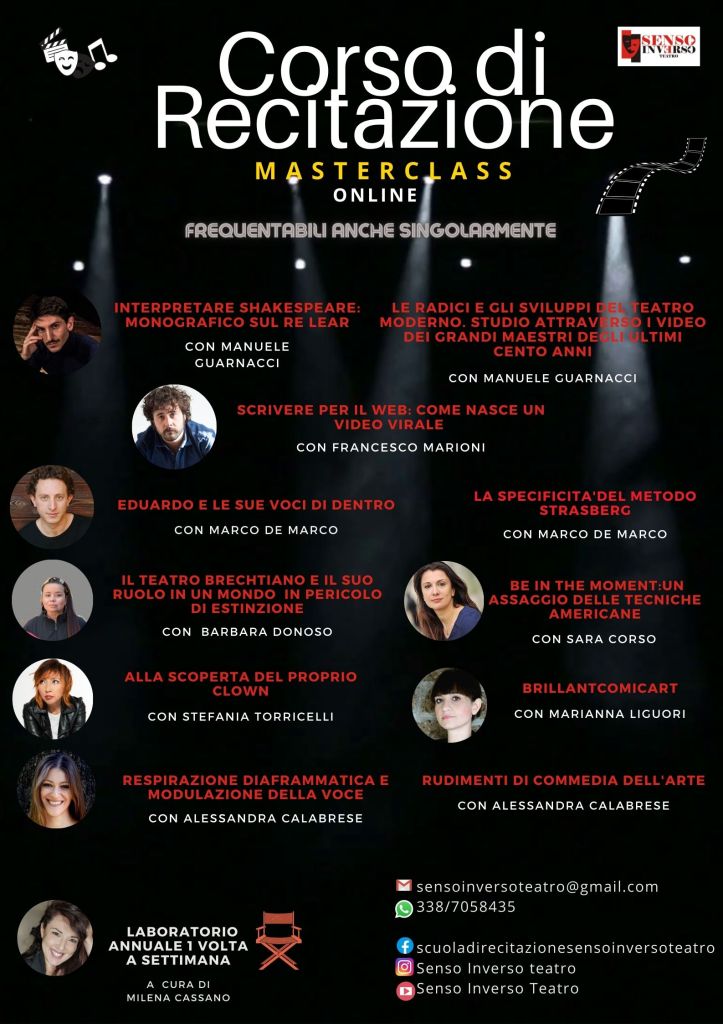 Corsi online ed in presenza di: Recitazione, Dizione, Comunicazione efficace e lettura espressiva, oltre a numerose masterclass periodiche tenute da docenti provenienti da varie parti d’Italia.